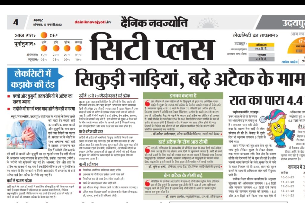 दैनिक नवज्योति में प्रकाशित इस लेख में डॉ. अमित खंडेलवाल, कार्डियोलॉजिस्ट, स्पर्श हार्ट केयर ने सर्दियों में हृदय रोगों के बढ़ते मामलों पर चर्चा की है।